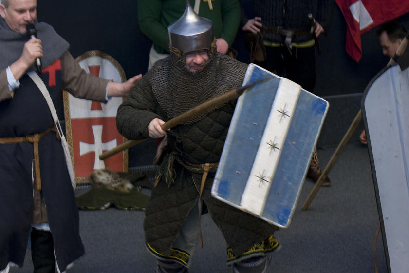 Zaczęto od projekcji filmowej przedstawiającej wygląd mieszkańców naszych ziem w wieku XII, XIII i XV. Po tym krótkim wprowadzeniu, studentom zaprezentowali się trzej wojownicy. Pierwszym był woj z plemion pruskich (Tomasz Marecki). Ubierając go w strój bojowy, prowadzący skrupulatnie omówił każdy elemencie jego ubioru i oporządzenia. Po pokazie woj wszedł pomiędzy dzieci, aby z bliska mogły obejrzeć jego broń i przedmioty, które miał ze sobą.